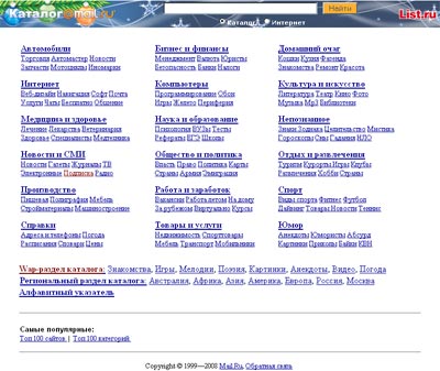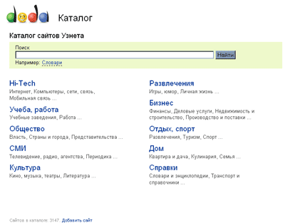 Оставшиеся ресурсы более-менее соответствуют понятию «каталог» – то есть обладают в разной степени неким минимальным функционалом – тематическими разделами, поиском, кратким описанием ресурса, возможностью для пользователя добавить свой сайт в каталог и т.п. Они отсортированы в порядке появления в результатах поиска и в том же порядке мы их и будем рассматривать.