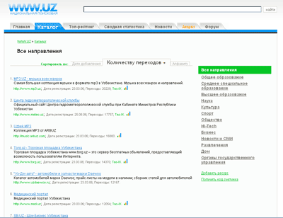 Из плюсов каталога можно отметить симпатичный дизайн, возможность сортировки списка сайтов по нескольким параметрам и некоторые дополнительные функции, такие как статистика количества переходов на ресурс, информация о том, находится ли сайт в TAS-IX, ссылка на статистику рейтинга НИПС (разумеется, если на ресурсе установлен счетчик), а также достаточно специфическая информация (скорее, более важная для самих владельцев каталога) – является ли сайт участником программы UzСertified и имеет ли он раздел на форуме центра Uzinfocom.