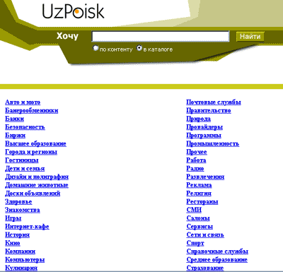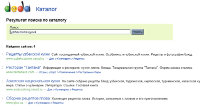 Некоторые местные каталоги, в том числе search.re.uz, search.uzip.uz, uzbekistan.by.ru и web.uz, открыться не пожелали, а link.uz и cat.uz отправляют пользователя не на каталог сайтов, а на ресурс с рецептами плова. Еще один каталог ChaQQon.com открылся, но пользоваться им оказалось практически невозможно, поэтому в дальнейшем я о нем упоминать не стану.