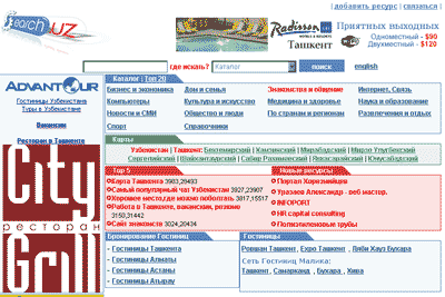 Поиск по каталогу – отдельная песня. Запрос «Компьютерный рынок Узбекистана» выдал 130 ресурсов, отсортированных не по релевантности, а по количеству переходов. Pc.uz оказался на 92-м месте. Возможностей у поиска – кот наплакал, но, как случайно выяснилось, у каталога есть более продвинутый поиск (http://search.uz/dir/ext_search.php), который принадлежит, как мне кажется, старой версии каталога. По крайней мере ниоткуда, кроме страницы добавления ресурса, ссылки на нее не ведут. На ней, кстати, по сайтам выдается намного больше информации – хиты, визиты, время регистрации и т.д.