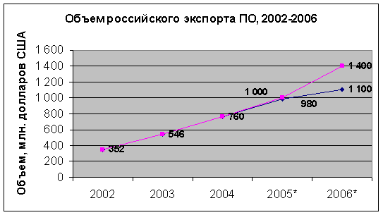 - Если посмотреть график объемов экспорта ПО (продуктов и услуг), то видно, что темпы роста не увеличиваются, а, наоборот, снижаются (с 50% в 2003 до 40% в 2004 и 30% в 2005). Это связано с завершением этапа экстенсивного развития в крупных центрах разработки (Москва, СПб, Новосибирск, Нижний Новгород), а также с быстрым ростом внутреннего рынка, который отнимает все больше ресурсов компаний-разработчиков.