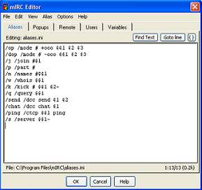 mIRC Editor представляет нам множество возможностей, но пока нам интересна вкладка Aliases. Именно здесь и создаются aliases. Но для того, чтобы alias работал, его надо определить. Определение alias имеет формат: