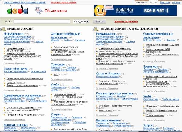 В первой группе в гордом одиночестве находится market.doda.uz. Принцип подачи информации – каталогового типа без отдельного меню категорий. Вся страница разделена на две основных раздела: купля/сдача в аренду и продажа/взятие в аренду, ко второму разделу совершенно непонятно почему прикручен обмен.