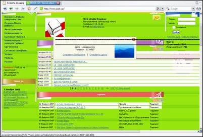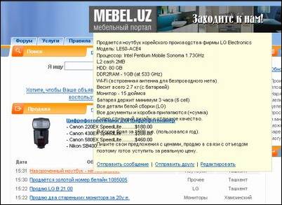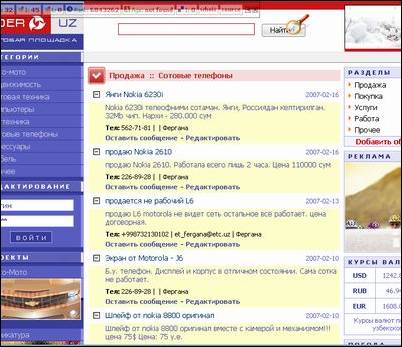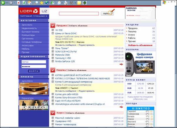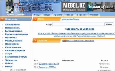 Вторая группа - побольше (идея более здравая?). Torg.uz, poisk.uz и lider.uz эксплуатируют одну и ту же концепцию – наличие основного меню категорий и/или разделов с вынесением последних объявлений из каждого раздела на главную. К текстам объявлений осуществляется доступ с помощью javascript (у lider.uz это вываливающиеся прямо на странице бары, у оставшихся – всплывающие окошки).
