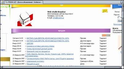 У poisk.uz также шестая Опера отказалась выдавать всплывающие окошки. А во всех браузерах, кроме IE, объявления с длинными строками, наплевав на границы окна, убегали вдаль… (см. рис. 11)