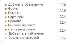 Пункты Форум, Помощь, Правила, Реклама на сайте (Услуги в верхнем меню) дублируются в обоих блоках. Добавить объявление продублировано в верхней части страницы. Как ни странно, пункт Экспорт в боковом меню не представлен, зато в нем есть уникальные (и в большинстве своем ненужные) пункты Партнеры, Контакты, Добавить в избранное и Сделать стартовой. Было бы логичнее (если уж одного меню кажется мало) вынести в верхнее меню информационные пункты, а в боковом оставить чисто технические вроде того же экспорта, поиска или добавления объявлений.