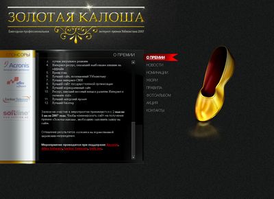 Как бы то ни было, учредитель премии, при спонсорской поддержке достаточно известных фирм, таких как Acronis, Aflex Software, SoftLine International и Sarkor Telecom, развил бурную деятельность. Был запущен сайт с весьма неблагозвучным именем , неудобной навигацией (во фреймах) и напрягающим дизайном (огромная блестящая калоша на черном фоне). Кстати, на главной странице сайта достаточно долго красовалось надпись «Золотая Галоша», потом оно таки было исправлено. На этом сайте была вывешена некоторая информация о премии, в том числе список номинаций и сроки проведения мероприятия.