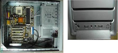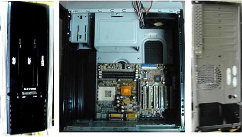 Строгая современная башенка цвета «черный металлик» вряд ли станет украшением офиса, зато гармонично впишется в любой интерьер. Функциональность передней панели минимальна - две кнопки (Power, Reset), индикаторы питания и активности жесткого диска, съемные панели для 5.25”и 3.5” отсеков, причем отсек для оптического привода имеет внешнюю панель, позволяющую использовать привод любого цвета, а отсек для флоппи-дисковода заглушен обычной заглушкой, поэтому цвет дисковода нужно будет подбирать специально.