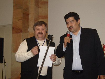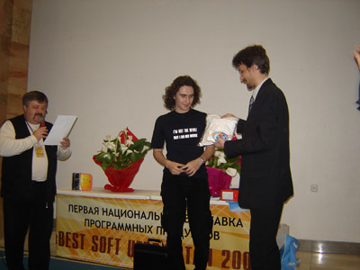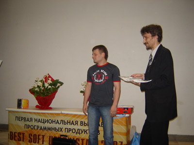 Время было выделено организаторами выставки достаточно неудобное – 17.30, всего за полчаса до закрытия выставки, когда экспоненты уже сворачивали свое имущество, а посетителей почти не осталось. Тем не менее, присутствовали практически все победители и немало зрителей. Провел награждение наш старейший IT-шоумен Александр Анатольевич Сучков. Ассистировал ему я, больше, пожалуй, мешая :-).