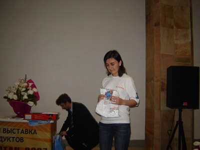 Диля Хасанова, сотрудник UZINFOCOM, призер интеллектуально-поискового конкурса. Диля получает десятитысячную карту TPS, флешку от нашего проекта и футболку от своей организации :-) |