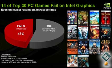 Во время одной из последних конференций NVIDIA продемонстрировала интересный слайд, на котором отмечается, что из 30 самых известных и продаваемых игр для ПК, у 14 имеются проблемы с визуализацией на видеокартах Intel G45. Тестирование проводилось в 32-битной ОС Windows Vista.