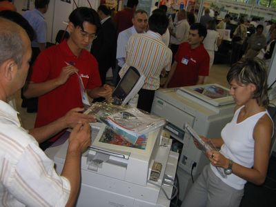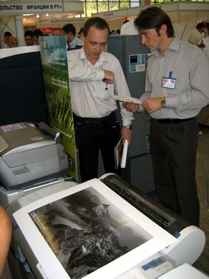 Недалеко от стенда SyTeCo расположился стенд компании Sharifa-T с продукцией фирм RISO и Xerox. Всем желающим демонстрировались решения этих компаний в области полиграфии. Здесь я тоже поинтересовался их мнением о выставке. К сожалению, ребята не смогли пока сформулировать свое мнение, что ж, думаю, само присутствие фирмы на выставке и количество экспонируемого оборудования можно считать положительным ответом. Отсутствие раздаточных материалов (и это через час после открытия!) наводит на мысль о пламенной активности молодежи в сборе «урожая» (смайл).