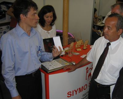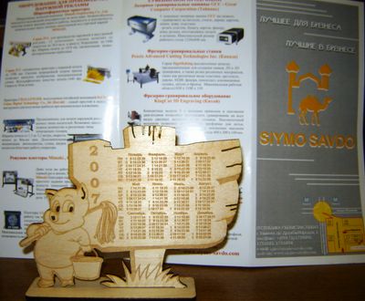 От Sharifa-T я переместился к стенду старых знакомых – компании SIYMO SAVDO. Возле него целый день толпился народ. Креативное мышление, которым всегда славилась фирма, и здесь не подвело. Стенд выделялся из всех в павильоне – эдакая мини-пагода с китайскими фонариками. Но самое интересное происходило внутри. Ребята привезли на выставку лазерный гравировальный аппарат для производства сувенирной продукции от фирмы GCC и вовсю «шлепали» сувенирчики, не забывая и о своей рекламе на них.