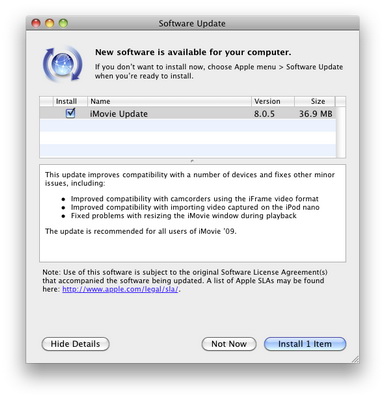 Одновременно с выходом новой версии программы для редактирования видео iMovie 8.0.5 компания Apple неожиданно объявила о появлении нового видеоформата. Формат, получивший название iFrame, будет основан на технологии видео H.264 и звуковом формате AAC. Также известно, что формат предложит нестандартное разрешение 960x540 пикселов. Еще одним отличием нового формата является относительно небольшой размер файлов при высоком качестве видео. Это несколько ускорит процесс импортирования роликов в iMovie и облегчит процесс редактирования. Сообщается, что первыми видеокамерами, поддерживающими видеоформат iFrame, станут модели VPC-HD2000A и VPC-FH1A от компании Sanyo. Что касается iMovie 8.0.5, то этот программный продукт также содержит следующие обновления: