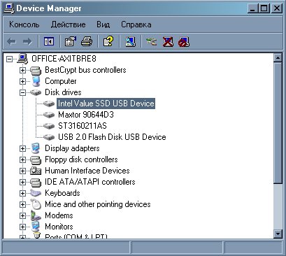 Пора проверить диск в работе. Устанавливаем его в один из разъемов USB на материнской плате. (Следует отметить, что не всякая плата позволит установить данный накопитель – из шести разъемов USB на трех материнках, бывших под рукой, без проблем удалось усадить его только на три разъема. В остальных случаях мешали установке слоты PCI, электролиты на плате или же радиаторы мостов. – Прим. авторов). Установка дополнительных драйверов не требуется - после запуска Windows, устройство без проблем опознается как «Intel Value SSD USB device» и становится доступным как обычный жесткий диск.