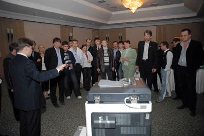 Затем с презентацией выступил продукт менеджер Московского Представительства Konica Minolta, господин Павел Зайцев, который ознакомил присутствующих с деятельностью компании Konica Minolta, подробно осветил модель bizhub C451 и bizhub PRO C6500, а также продемонстрировал всем собравшимся функциональные возможности bizhub C451.