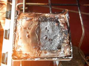 На картинке видно, что на подошве ватерблока есть серые пятна. Это олово. Как было сказано выше, при кипении металла воздух из пазов для ребер выходит и снаружи получаются отверстия. У меня их оказалось 6.