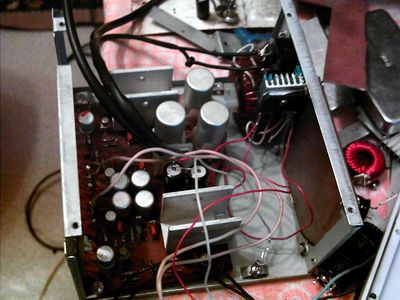 Вообще, сам корпус от блока питания настолько удобен для подобных экспериментов, что на его основе в компьютер можно встроить очень и очень многое. В нем, например, можно уместить большинство компонентов СВО. Очень удобно, то, что сам корпус выполняет роль хорошего экрана и какие либо наводки не страшны. Далее соединяем плату УНЧ с платой коррекции НЧ, ВЧ, баланса и громкости. На фото 3 и 4 хорошо видно, что вся работа сводится только к грамотному расположению плат внутри корпуса БП. Внизу находится плата УНЧ, а над ней плата коррекции НЧ, ВЧ, баланса и громкости. Все соединения между этими двумя платами следует производить экранированным проводом, дабы избежать лишних шумов и т.п.