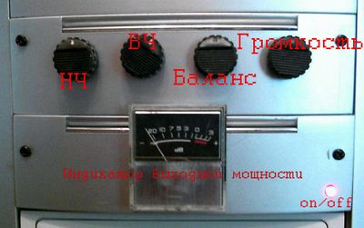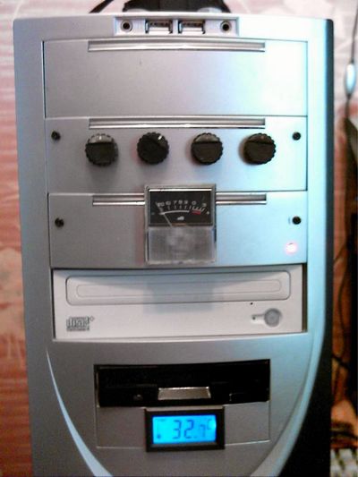 Передняя панель делается из двух заглушек. В той, которая будет верхней, просверливаем 6 отверстий. Два отверстия диаметром 3мм и четыре диаметром 5 мм. Два по 3 мм используются для крепления заглушки к блоку питании, к той стороне, которая будет лицевой. В оставшиеся четыре вставляются ручки регуляторов НЧ, ВЧ, баланса и громкости. На нижней панели устанавливаем индикатор выходной мощности нашего усилителя. Так же нелишне будет установить и простейший индикатор работы. Эту роль играет простой АЛ307 подключенный к 12 вольт через ограничивающий резистор (его следует подобрать исходя из желаемой яркости свечения). На фото 5 видно как получилось. Вся конструкция занимает два пустых слота для CD-ROMов.