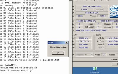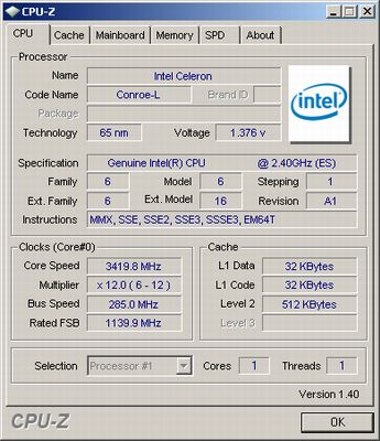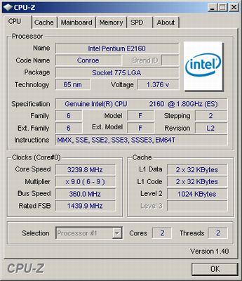 Процессор Pentium E2160 поддавался разгону полегче. Увеличение питающих напряжений было при этом такое же, как и в предыдущем случае. Максимально удалось запустить на 380x9 = 3,42GHz, но первый скрин нормально снялся на частоте 3,24GHz (360x9).