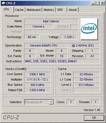 Попытка оценить максимальную частоту шины, на которой процессор работал стабильно, дала 300MHz (300x11=3,3GHz). Температура процессора в различных приложениях не превышала 38*С.