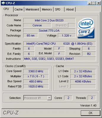 Процессор Core 2 Duo E6320 разогнался максимально до частоты 3.36GHz (480x7), нам кажется, что это для него не предел, но тут уже подкачала память. Даже для получения этого значения ее тайминги пришлось увеличить с 5-5-5-15 до 6-6-6-20. Увеличение напряжений при разгоне и последующих тестах: питание ядра + 0.05V, DDR +0.2V, северный мост и FSB +0.01V.