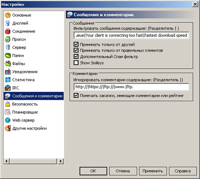 Раньше этот раздел входил в состав раздела «Безопасность», что и показывает его значение. С помощью личных посланий некоторые хакеры ухитряются найти лазейку в вашу систему, да и спамеры, как всегда, не дремлют. Для нормальной работы можно оставить стандартные настройки Мула.