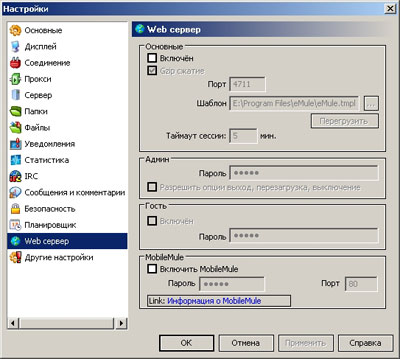 В данном разделе вы можете настроить возможность работы с Мулом с другого компьютера (веб-сервер) или мобильного телефона (MobileMule). Телефон, естественно, должен поддерживать эту функцию.