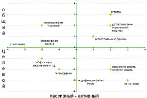 В этой системе координат разместим виды самозащиты вредоносных программ. Следует помнить, что приведенная диаграмма — не более чем игрушечное наглядное пособие, позволяющее сориентироваться в технологиях самозащиты вредоносных программ. Эта модель — субъективное построение автора, основанное, однако, на тщательном анализе поведения вредоносных программ.