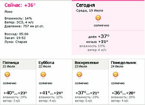 На решенном в минималистском стиле, дается прогноз погоды на неделю вперед в Ташкенте, Бухаре, Намангане, Нукусе, Самарканде Термезе, Фергане и Хиве. Удобно и наглядно – только бросив взгляд на главную страницу, мы узнали что самый жаркий день на этой неделе температуру 41 градус по Цельсию поджидает ташкентцев в субботу, 22 июля. Те же, кого интересует динамика «прожаривания», могут открыть специальный график, на котором наглядно видны все изменения на ближайшую неделю.
