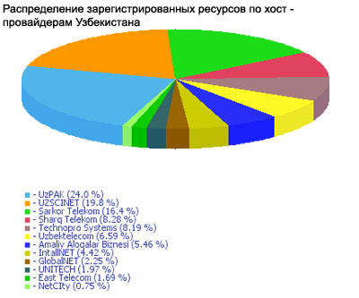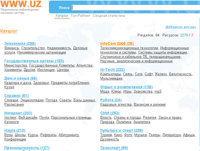 На сегодняшний день в системе зарегистрировано 2275 информационных ресурсов, причем каждый день добавляются новые. В домене UZ зарегистрировано 1863 ресурса, в других доменах - 686. Больше всего ресурсов зарегистрировано в разделе «Экономика» (296), «Культура и спорт» (258), «СМИ» (253), «Наука» (213) и «Интернет» (204).