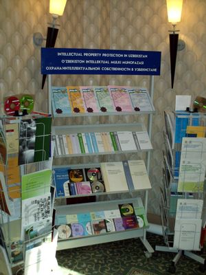 Во время перерыва на чашку чая участники конференции могли ознакомиться с установленными в фойе стендом Патентного ведомства, демонстрирующим деятельность ведомства, а также со стендом Узбеккино, на котором были представлены образцы выпускаемой объединением лицензионной продукции.