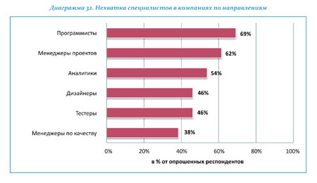 В то же время, результаты исследования вскрыли и массу трудностей, испытываемых компаниями и касающихся их дальнейшего развития. Прежде всего, это нехватка кадров, вызванная высокими темпами роста рынка и недостаточным количеством подготавливаемых квалифицированных специалистов – программистов, дизайнеров, аналитиков, менеджеров, маркетологов. Вопрос нехватки кадров усугубляется оттоком специалистов в зарубежные страны. В силу дефицита квалифицированных кадров, команды программистов вынуждены работать малыми группами, что соответственно сказывается на объемах экспорта ПО.