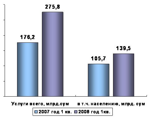 В первом квартале 2008 года в сфере ИКТ оказано услуг на сумму 275,8 млрд. сум, в т. ч. населению оказано услуг на сумму 139,5 млрд. сум.