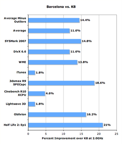 Результаты сравнения тестового Quad-Core Opteron 2,5 ГГц с Opterons K8 приведены ниже в диаграмме.