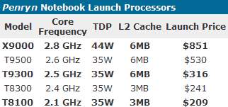 Вероятно, процессоры будут представлены на выставке CES 2008, которая пройдет 7 января, а позже будут участвовать в мероприятии Apple MacWorld 2008, посвященном обновленным ноутбукам MacBook Pro. Ниже представлен список моделей с указанием названия, частоты, уровня энергопотребления, размера кэш-памяти второго уровня, а также рекомендуемой Intel цены на дату запуска.