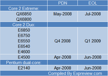 Таким образом, уже в июне будет прекращен выпуск 2-ядерных процессоров Pentium E2140 и Core 2 Duo E4500. В июле сняты с производства будут 4-ядерные модели Core 2 Extreme QX6800 и QX6850.