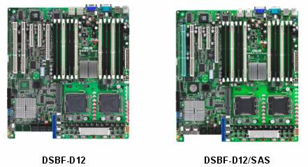 Компания ASUS разработала серверные платы ASUS DSBF-D12 и DSBF-D12/SAS. Эти платы поддерживают как двуядерные процессоры семейства Intel Xeon 5000/5100, так и четырехъядерные процессоры семейства Intel Xeon 5300, и используют модули памяти ECC DDR2 FBD (полностью буферизованные модули с контролем четности).