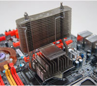 LAN Party UT NF680I LT SLI-T2R может похвастаться оригинальной системой охлаждения северного моста, которая представляет собой комбинированный вариант обычного радиатора и кулера на тепловых трубках, который, видимо, будет обдуваться небольшим вентилятором.