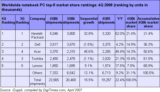 В четвертом квартале 2006 года тайваньская компания Acer продала 3.4 миллиона мобильных ПК, на 45.6% больше, чем в третьем квартале, продемонстрировав самые высокие темпы роста среди пятерки ведущих компаний-поставщиков. Компании удалось обойти по этому показателю ведущего производителя мобильных ПК Hewlett-Packard, который занял лишь второе место по темпам роста с показателем 32.8%.