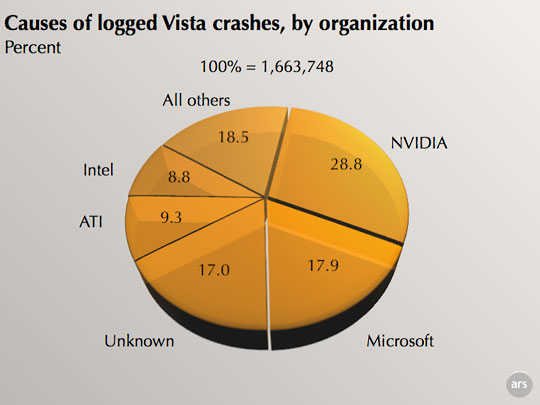 Центральной частью отчета Microsoft является график, отражающий зависимость между количеством сбоев и оборудованием, из-за которого это произошло. Для составления графика были использованы 1664 тыс. автоматических отчетов Vista, из которых 479 тыс. сбоев или 29% были вызваны ошибками в драйвере NVIDIA, 17,9% - из-за собственных драйверов Microsoft, еще 17% - по неизвестным причинам. Четвертое место заняло оборудование ATi - 9,3% сбоев, а драйверы Intel замкнули этот ряд и стали причиной 8,8% сбоев.