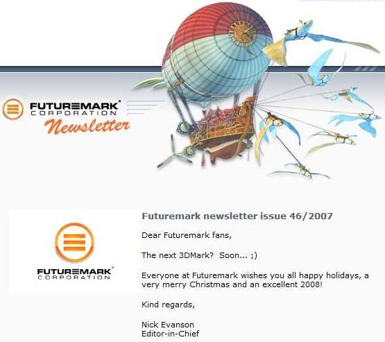 В 46 письме рассылок новостей за 2007 года, компания Futuremark косвенно сообщила своим подписчикам о том, что готовится выход нового 3D Mark. В письме буквально написано: «Когда выйдет новый 3D Mark? Скоро...».