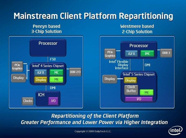Фактически, Intel интегрировала весь северный мост в процессор, что не только уменьшает общую стоимость системы, но и позволяет создавать более компактные ПК. Производство чипов Westmere ведётся уже с сентября, а потому у Intel всё готово к массовому выходу на рынок.