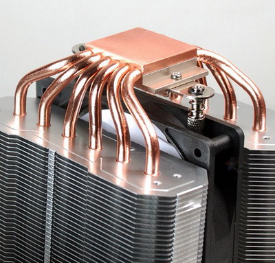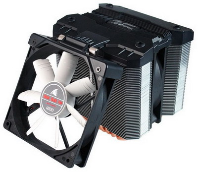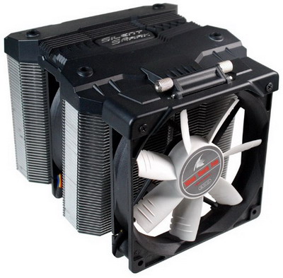 Конструкция Silent Shark включает две башни из алюминиевых пластин, нанизанных на шесть тепловых трубок шестимиллиметрового диаметра. Радиаторы обдуваются потоками воздуха, которые создает пара 120-миллиметровых вентиляторов: Evercool SSF-12 и Silent Fan.