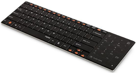 Rapoo E9080 компактней большинства стандартных клавиатур благодаря плотной компоновке. Наличие тачпада, совмещенного с цифровым блоком, делает эту клавиатуру неплохим выбором как для работы за десктопом, так и для управление медиацентом или медиа-ПК.