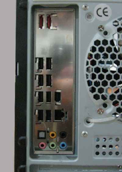 На заднюю стенку выведены 8 разъемов USB 2.0, разъем FireWire (IEEE1394), гнездо гигабитного адаптера, два разъема eSATA и выводы звука.