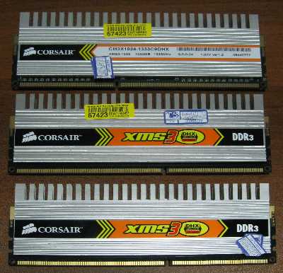 В данной машине установлено три модуля 1 Гб DDR3 SDRAM Corsair CM3X1024-1333C9DHX. Данная память хоть и DDR3-1333, тем не менее, из-за особенностей архитектуры процессора, без разгона шины работает только как DDR3-1066.