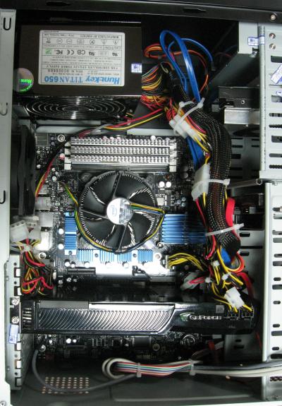 Компьютер собран в строгом черно-серебристом корпусе с логотипом TS-Technology, питание в целом неслабой системы обеспечивает блок питания Huntkey Titan 650. Для улучшения температурного режима на задней стенке корпуса установлен дополнительный вентилятор.
