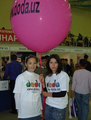 А вот портал doda.uz, обыгрывая шарики в своем названии, подвесил к шарику симпатичного пилота. Шар проплывал по выставке во всех направлениях, веселя посетителей, пока оглушительно не лопнул ближе к вечеру.