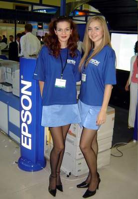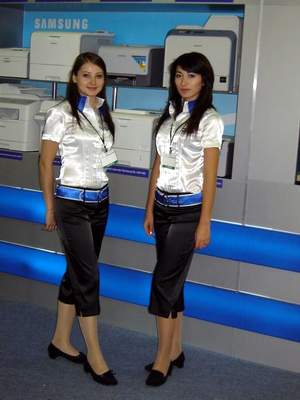 Экспозиции остальных участников исполнены более традиционно, привлекает внимание разве что Teleset Alfa с продуктами Epson. Симпатичный стенд, выполненный в синей гамме радует глаз, ничего лишнего – заостряется внимание только на продукции да на симпатичных девушках, представляющих бренд. О девушках разговор особый пойдет ниже.